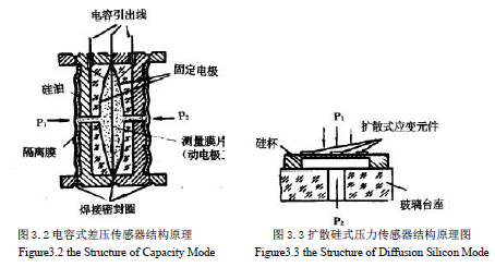擴散硅式壓力傳感器見圖3.3。丈量敏感元件為周邊固支的硅杯,在此杯單晶硅膜片的上下兩側出現壓差時膜片內部孕育發生應力。在壓力P1、P2 作用下電橋出現不均衡,輸出一個正比于壓力變革的電壓信號。